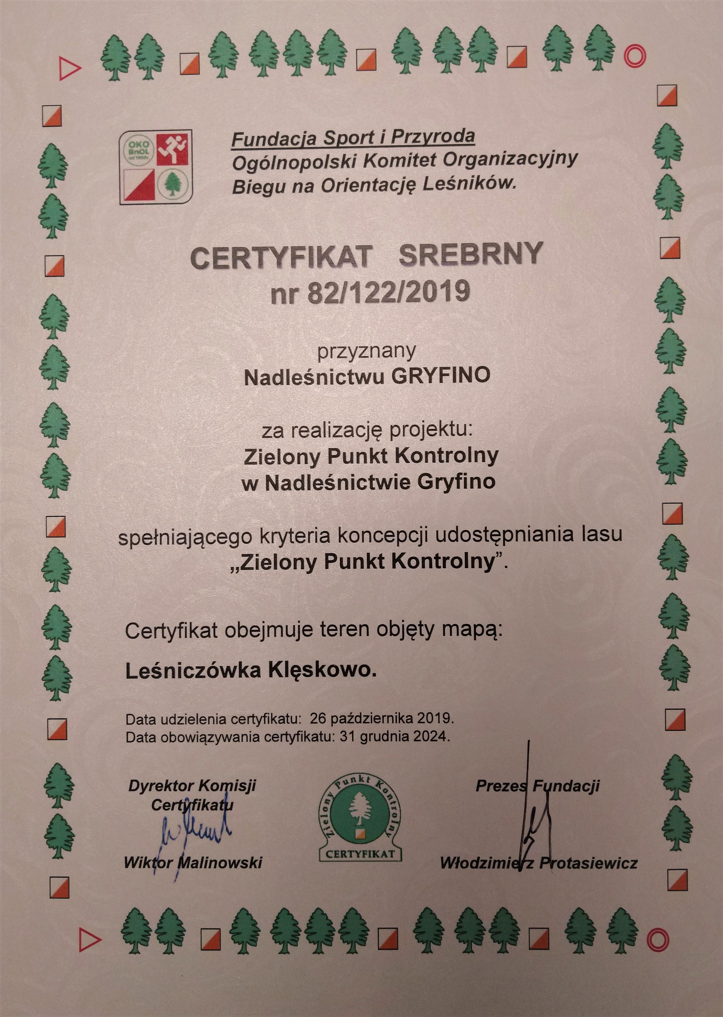Wymarsz zespołów poprzedziło uroczyste przecięcie wstęgi na tablicy informacyjnej dedykowanej projektowi i zawierającej poza krótkim opisem pomysłu i regulaminem - QR kody, dzięki którym mapy przygotowanych tras i broszurę informacyjną można pobrać także w terenie. Otwarcia dokonali - Nadleśniczy Nadleśnictwa Gryfino Ryszard Brygman i Magdalena Baczulis reprezentująca Stowarzyszenie Klub Orientacji Sportowej Bno Szczecin. Zielony punkt kontrolny Nadleśnictwa Gryfino uzyskał również Srebrny Certyfikat przyznany przez Fundację Sport i Przyroda Ogólnopolski Komitet Organizacyjny Biegów na Orientację Leśników.